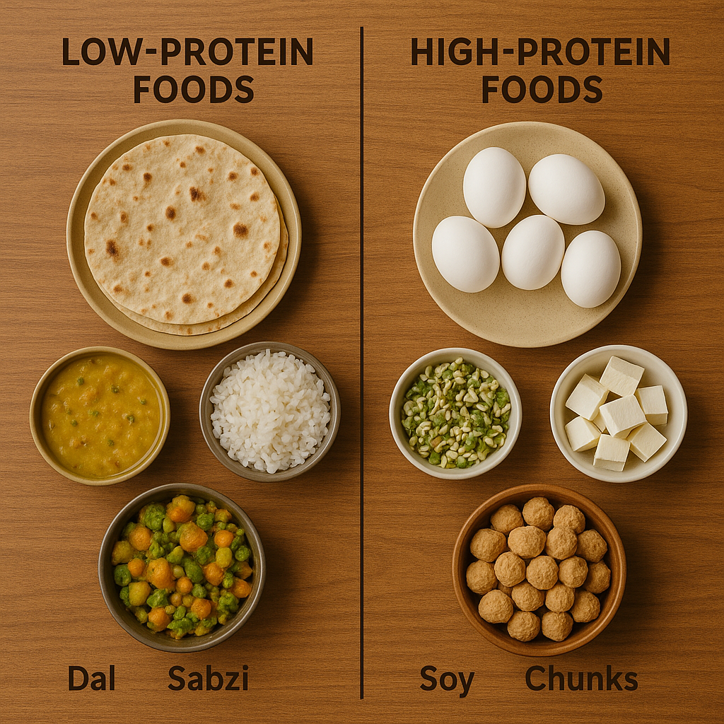 Roti, rice, dal, and sabzi are healthy but low in protein.