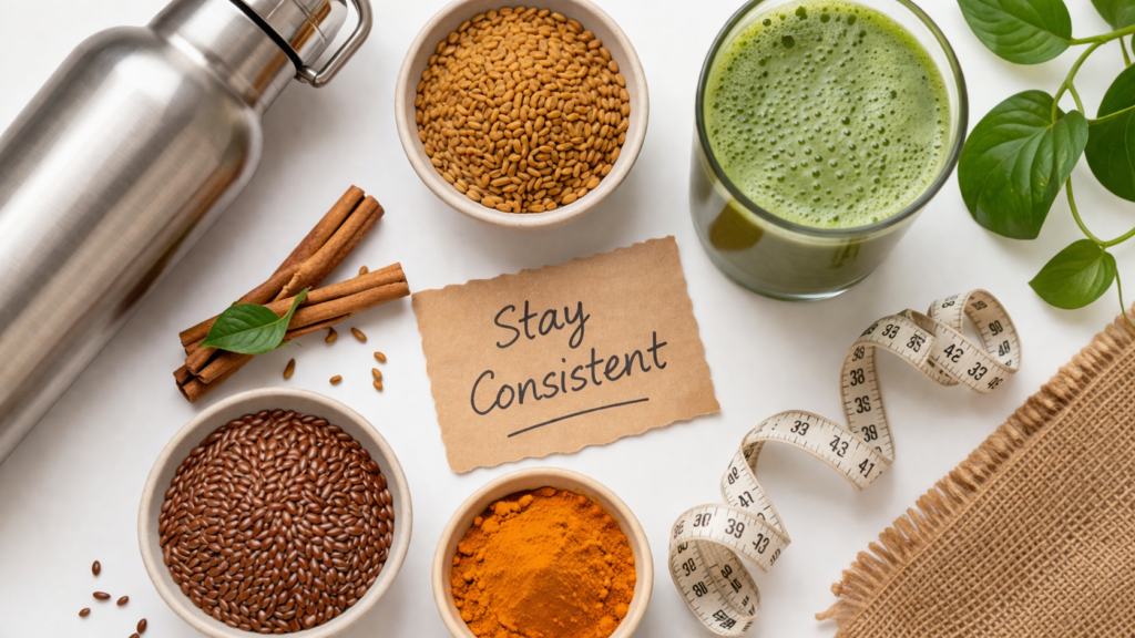 - Cinnamon (Dalchini): Sprinkle a pinch in your morning tea or on oatmeal. Cinnamon has insulin-like activity and helps stabilize blood sugar — critical for both PCOS and thyroid.